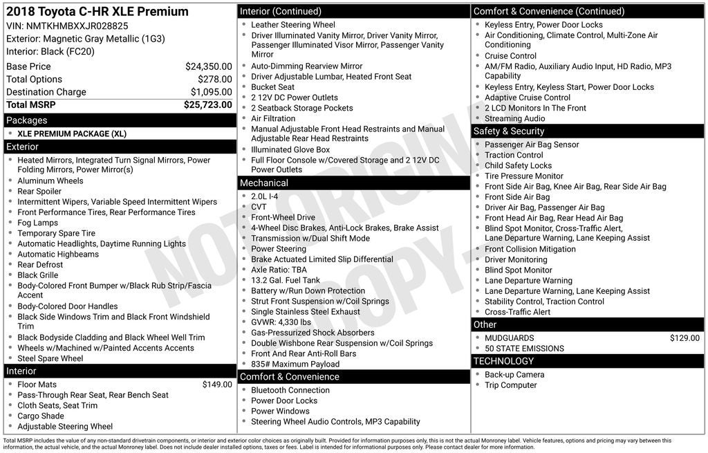 XLE Premium Package:Integrated Fog Lights, Smart Key System with Push Button Start, Blind Spot Monitor with Integrated Rear Cross Traffic Alert, Auto Fold Outside Mirrors, Puddle Lamp with "Toyota C-HR" Projection, Front Seat Heaters, and Driver Power Lumbar
