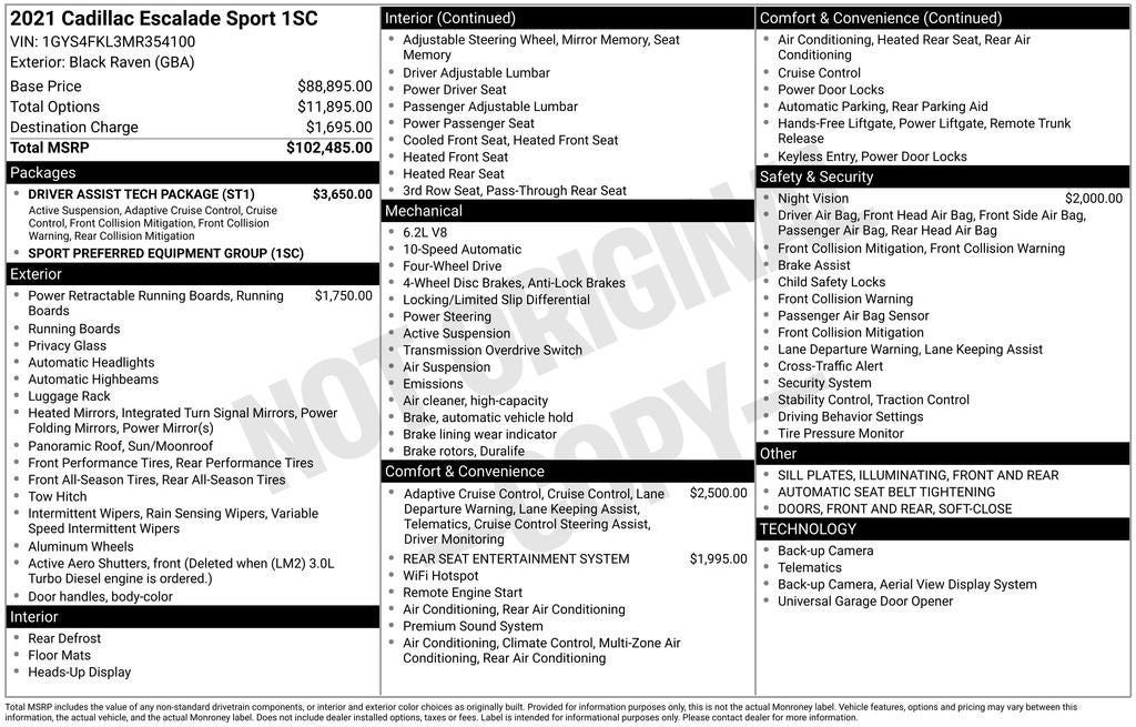 New Price! Black Raven Sport 4WD 10-Speed Automatic with Overdrive 6.2L V8 Sunroof / Moonroof, Back Up Camera, Bluetooth®, Clean History Report, a Clean, One Owner Carfax, 4WD, Jet Black w/Leather Seating w/Precision Perforated Inserts, 16.9 Diagonal OLED Infotainment Screen, 19 Speakers, 2-Presets Memory For Driver Seat Adjuster, 3.23 Axle Ratio, 3rd row seats: split-bench, 4-Way Power Driver Lumbar Seat Adjuster, 4-Wheel Disc Brakes, 8-Way Power Driver Seat Adjuster, 8-Way Power Front Passenger Seat Adjuster, ABS brakes, Adaptive Cruise Control, Adaptive suspension, Air Ionizer, Air Ride Adaptive Suspension, AKG Studio 19-Speaker Audio System, AM/FM radio: SiriusXM with 360L, Audio memory, Auto High-beam Headlights, Auto tilt-away steering wheel, Auto-dimming Rear-View mirror, Automatic Seat Belt Tightening, Automatic temperature control, Brake assist, Door Lock & Latch Shields, Driver Assist Tech Package, Dual front impact airbags, Dual front side impact airbags, Electronic Cruise Control w/Set & Resume Speed, Electronic Limited-Slip Differential, Electronic Stability Control, Emergency communication system: OnStar and Cadillac connected services capable, Enhanced Automatic Emergency Braking, Enhanced Automatic Parking Assist, Four wheel independent suspension, Front anti-roll bar, Front Center Armrest w/Storage, Front dual zone A/C, Fully automatic headlights, Glass Breakage Sensor, Heads-Up Display, Heated & Ventilated Driver & Front Passenger Seats, Heated door mirrors, Heated rear seats, Heated steering wheel, Hitch Guidance w/Hitch View, Integrated Trailer Brake Controller, Lane Keep Assist w/Lane Departure Warning, Low tire pressure warning, Magnetic Ride Control Suspension, Memory seat, Night Vision, Occupant sensing airbag, Overhead airbag, Power door mirrors, Power driver seat, Power Liftgate, Power Panoramic Tilt-Sliding Sunroof, Power passenger seat, Power-Retractable Assist Steps, Preferred Equipment Group 1SC, Rain sensing wipers, Rear air conditioning, Rear anti-roll bar, Rear Camera Mirror, Rear Camera Mirror Washer, Rear Cross Traffic Alert, Rear Seat Entertainment System, Rear window defroster, Rear window wiper, Reconfigurable Full-Color Head-Up Display, Remote keyless entry, Reverse Automatic Braking, Running Board Assist Steps, Soft Closing Front & Rear Doors, Split folding rear seat, Steering wheel memory, Super Cruise, Telescoping steering wheel, Theft-Deterrent Alarm System, Tilt steering wheel, Traction control, Trailer Side Blind Zone Alert, Variably intermittent wipers, Vehicle Inclination Sensor, Vehicle Interior Movement Sensor, Wheels: 22 12-Spoke Polished Alloy, Wireless Apple CarPlay/Wireless Android Auto.