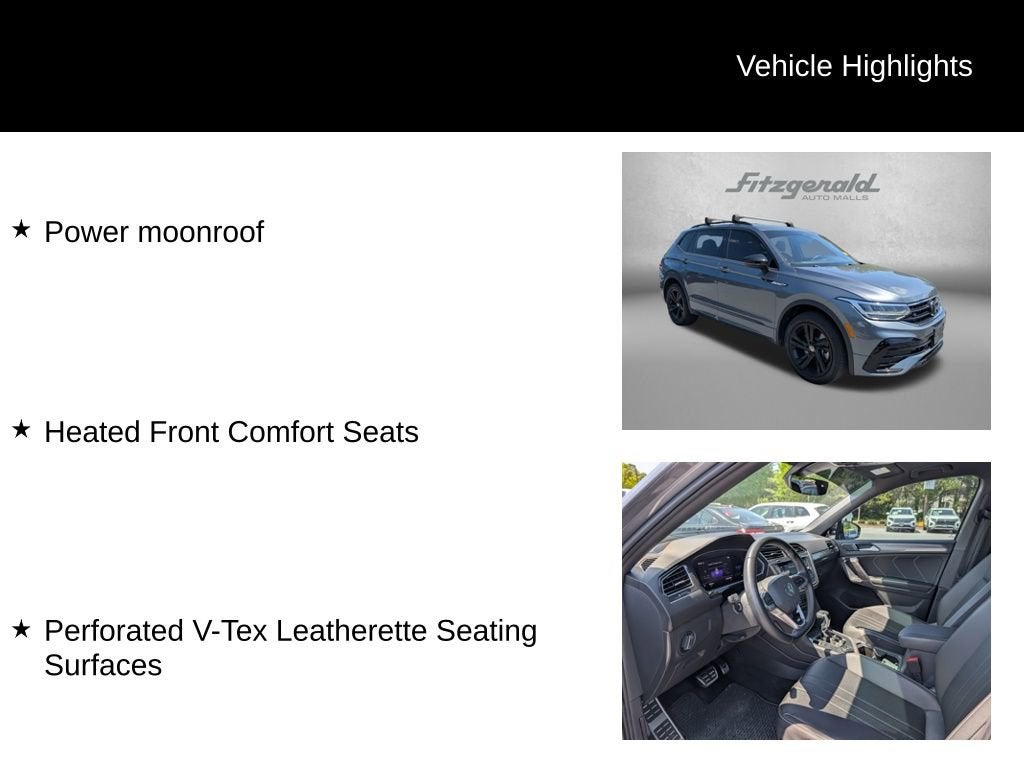 2023 Platinum Gray Metallic Volkswagen Tiguan 8-Speed Automatic with Tiptronic AWD, Heated Front Comfort Seats, Perforated V-Tex Leatherette Seating Surfaces, Power moonroof. 2.0L TSI DOHC 2.0T SE R-Line Black You will love our NO HAGGLE, NO HASSLE PRICING here at Fitzgerald Auto Mall. Ask us about our BUYER PROTECTION PLAN, LOANER CAR PROGRAMS, AND FREE Vehicle History Report. Can not find what you want?? NO PROBLEM! We have over 1,000 Pre-Owned vehicles available at WWW.FITZMALL.COM. You can also visit us in person at 114 Baughmans Lane Frederick MD, 21702 or Call Us @240-629-7301.