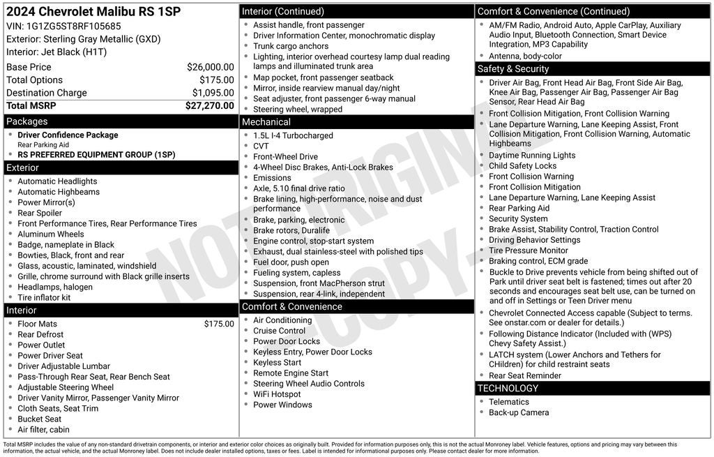 Sterling Gray Metallic 2024 Chevrolet Malibu RS FWD CVT 1.5L DOHC Jet Black Cloth.