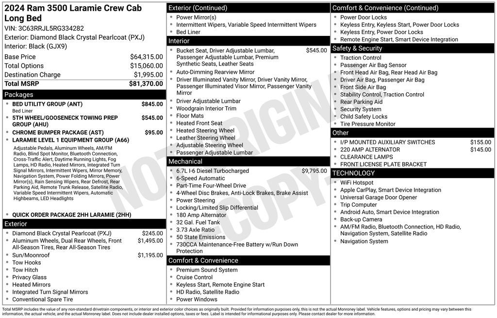 Diamond Black Crystal Pearlcoat Laramie 4WD 6-Speed Automatic Cummins 6.7L I6 Turbodiesel Sunroof / Moonroof, Back Up Camera, Bluetooth®, 10 Speakers, 115V Auxiliary Rear Power Outlet, 12 Touchscreen Display, 220 Amp Alternator, 2nd Row In Floor Storage Bins, 3.73 Axle Ratio, 4-Wheel Disc Brakes, 4G LTE Wi-Fi Hot Spot, 5th Wheel/Gooseneck Towing Prep Group, ABS brakes, Active Noise Control System, Alexa Built-In, AM/FM radio: SiriusXM with 360L, Apple CarPlay/Android Auto, Auto Adjust In Reverse Exterior Mirrors, Auto Dimming Exterior Passenger Mirror, Auto High Beam Headlamp Control, Auto Power-Folding Mirrors, Auto-Dimming Exterior Mirrors, Automatic temperature control, Bed Utility Group, Blind Spot & Cross Path Detection, Brake assist, Bright Front Bumper, Bright Rear Bumper, Center Hub, Chrome Bumper Package, Chrome Exterior Mirrors, Clearance Lamps, Connected Travel & Traffic Services, Connectivity - US/Canada, Disassociated Touchscreen Display, Dual front impact airbags, Dual front side impact airbags, Dual Rear Wheels, Electronic Stability Control, Exterior Mirrors Courtesy Lamps, Exterior Mirrors w/Heating Element, Exterior Mirrors w/Memory, Exterior Mirrors w/Supplemental Signals, Foam Bottle Insert (Door Trim Panel), For Details Visit DriveUconnect.com, Forward & Reverse Utility Lights, Front anti-roll bar, Front Center Armrest w/Storage, Front dual zone A/C, Front LED Fog Lamps, Front Seat Back Map Pockets, Fully automatic headlights, GPS Navigation, Heated door mirrors, Heated Front Seats, Heated Steering Wheel, Integrated Voice Command w/Bluetooth®, Laramie Level 1 Equipment Group, Leather Trim 40/20/40 Bench Seat, LED Bed Lighting, LED Reflector Headlamps, LED Tail Lamps, Low tire pressure warning, Mirror Running Lights, MOPAR Deployable Bed Step, MOPAR Spray In Bedliner, Navigation System, Occupant sensing airbag, Off-Road Information Pages, Overhead airbag, ParkSense Front/Rear Park Assist System, ParkView Rear Back-Up Camera, Power Adjust 8-Way Driver Seat, Power Adjust Mirrors, Power Adjustable Pedals w/Memory, Power driver seat, Power Heat Fold Memory Telescopic Mirrors, Power passenger seat, Power Sunroof, Power Telescoping Mirrors, Power-Adjustable Convex Aux Mirrors, Quick Order Package 2HH Laramie, Radio: Uconnect 5 Nav w/12.0 Display, Rain Sensitive Windshield Wipers, Rear 60/40 Folding Seat, Rear Power Sliding Window, Rear Window Defroster, Remote keyless entry, Remote Tailgate Release, Security system, Selectable Tire Fill Alert, Speed control, Tilt steering wheel, Traction control, Trailer Tow Pages, Variably intermittent wipers, Wheels: 17 x 6.0 Polished Aluminum.