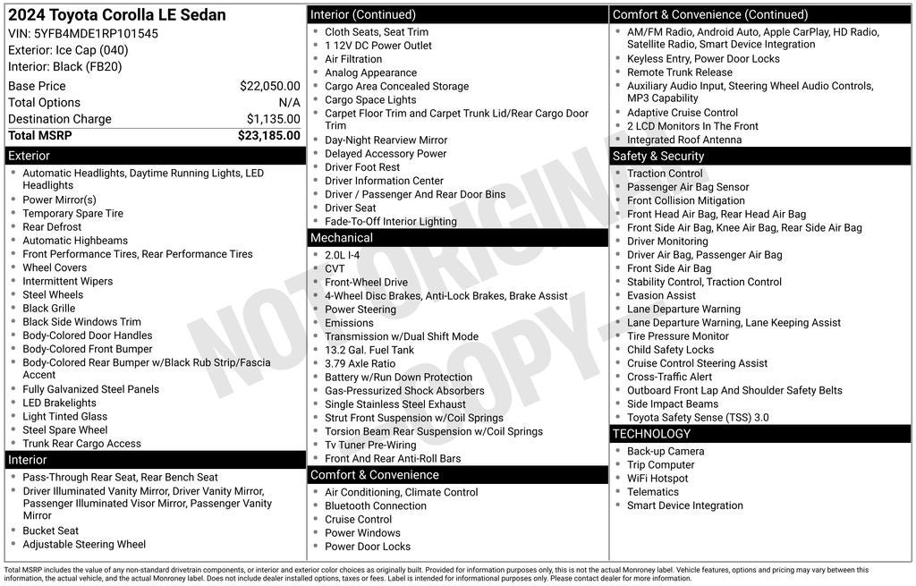 Ice Cap LE FWD CVT 2.0L I4 DOHC 16V Back Up Camera, Bluetooth®, Audio Controls on the Steering Wheel, Clean Cloth Interior, Cruise Control, Proximity Keyless Entry, Rear View Camera, Satellite Radio, Side Air Bags, 16 Steel Wheels w/Covers, Air Conditioning, Auto High-beam Headlights, Delay-off headlights, Dual front impact airbags, Emergency communication system: Safety Connect (up to 10-year trial subscription), Exterior Parking Camera Rear, Fabric Seat Trim, Front anti-roll bar, Front Center Armrest, Fully automatic headlights, Power door mirrors, Power steering, Radio data system, Radio: 8 Toyota Audio Multimedia, Rear window defroster, Steering wheel mounted audio controls.