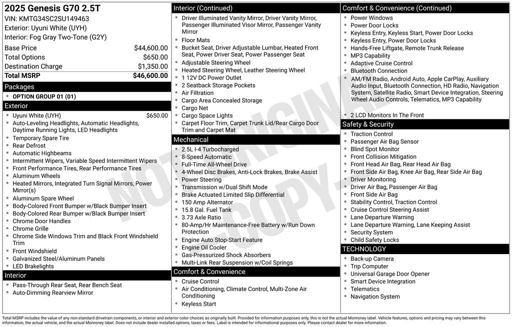 Uyuni White 2025 Genesis G70 2.5T AWD 8-Speed Automatic I4