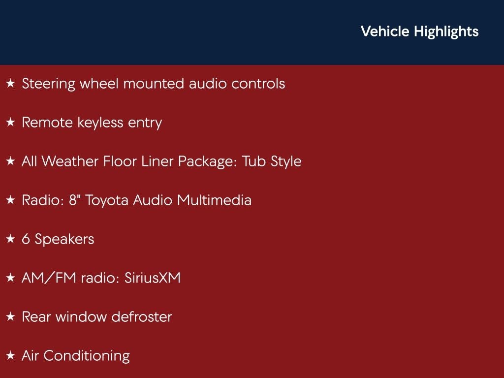 - 8-in. Toyota Audio Multimedia w/ 6-Speakers, Wireless Apple CarPlay and Android Auto Compatibility