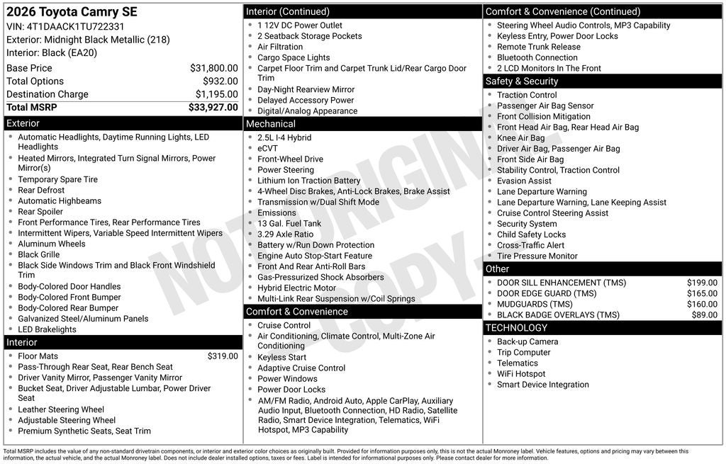 6x7 2026 Toyota Camry SE FWD eCVT 2.5L 4-Cylinder 16V DOHC black Cloth.
